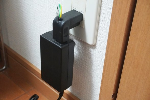 一方で、ACアダプター+コンセントプラグの組み合わせで使うと、下の写真のような感じで使えます。ケーブルが短くなります。