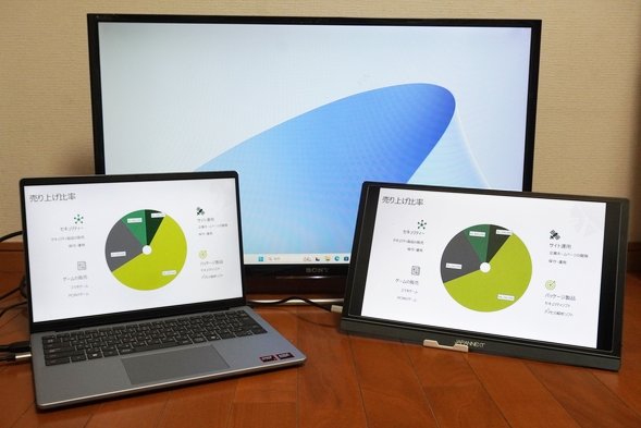 HDMIとUSB Type-Cの2つのポートを使えば、PCの画面と合わせて最大3画面に表示することができます。上の写真ではPCと同じ画面を1つのモニターに表示し、もう一つのモニターには別の画面を表示していますが、すべて違う画面にすることもできます。つまり、モニターを2つつないで3つの画面でそれぞれ別の作業を行うこともできるようになります(マルチモニター)。