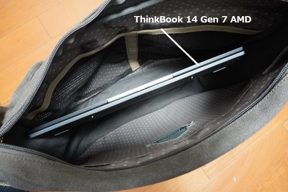 Lenovo ThinkBook 14 Gen 7 AMDは14インチで約1.4kgの重さのノートパソコンです。14インチの画面があるので作業がしやすいです。頻繁に持ち運ぶのは少し難しいかもしれませんが、十分に持ち運べる軽さなので、時々は外に持ち出して使用することも可能です。
