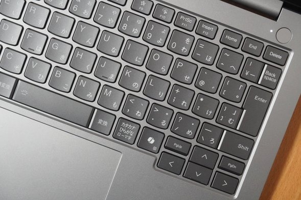 キーボードです。グレイのキーにホワイトの文字が刻印されていて、本体のカラーともマッチしています。