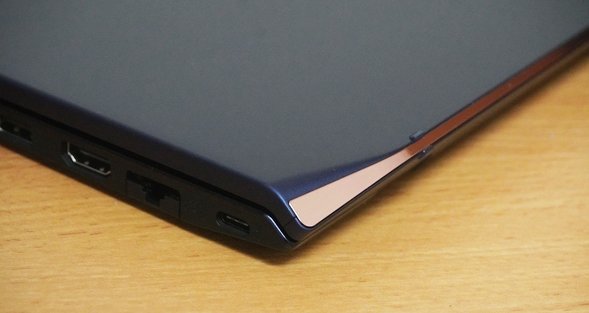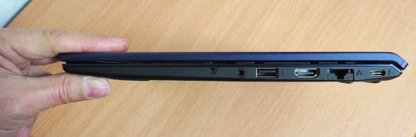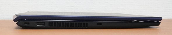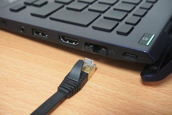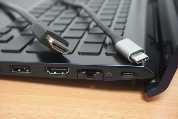 うれしいのが有線LANポートです。ここにはLANケーブルを挿すことができます。一般的にWi-Fiを使ってネット接続すると、電子レンジの電波や近所のアクセスポイントの電波と干渉してしまったりすることがあるのですが、LANケーブルではそのようなことはなく、高速で安定した通信が可能になります。ネット会議やテレワークなどで、接続が切れては困るようなときに使うと便利です。ノートパソコンで有線LANを搭載した製品は少ないのでとてもありがたいです。