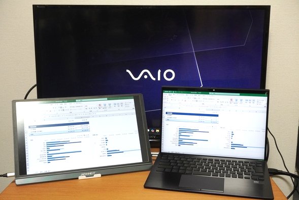 HDMIもUSB Type-Cも問題なく使うことができました。モニターやプロジェクターなどにしっかり対応できます。PCの画面と同じものを映し出すだけでなく、画面を拡張して2画面で作業することも問題ありません。両方のケーブルを使えば、下の写真のように複数のモニターを使って作業することができるようになります。