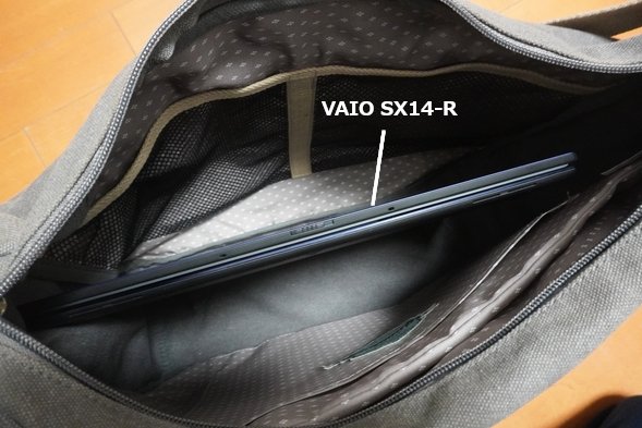 このようにVAIO SX14-Rは薄くて軽いノートパソコンなので、カバンに入れて持ち運ぶのも問題ありません。実際にカバンにA4ノートと一緒に入れてみると、かさばることもなく、ちょうどよい感じでカバンに収まりました。しかも軽いので、疲れにくいのがうれしいですね。