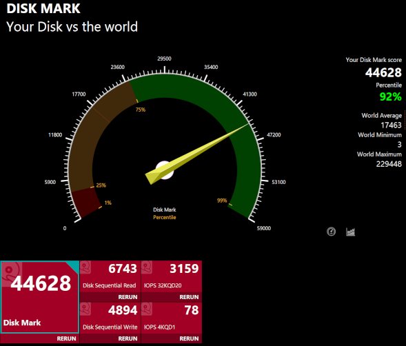 SSDの読み書きの速度です。44628となっていて、とても高いスコアとなりました。高速な動作が可能です。