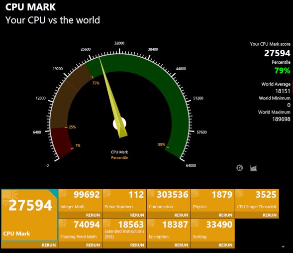 CPUとSSD(ストレージ)の性能をPassmarkというソフトを使って測定しました。使用した製品のスペックについては、スペックの確認の項をご参照ください。