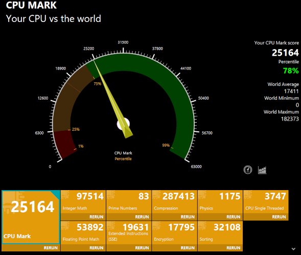 CPUのスコアは25164となりました。非常に高いスコアです。パソコンの処理が高速になるので、とても快適に使えるでしょう。