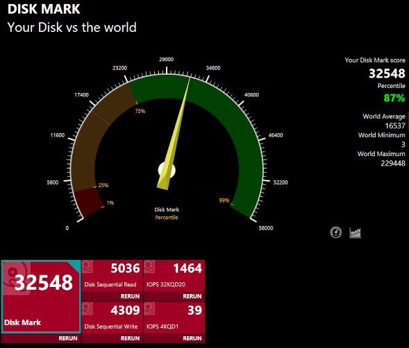 続いてSSDのベンチマークです。スコアは32548となりました。データの読み書きが非常に高速で、とても快適に使うことができます。