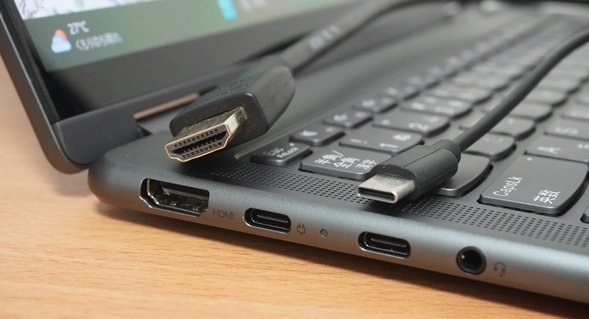 モニターやプロジェクターへの出力はHDMIとUSB Type-Cポートを使って行うことができます。プレゼン発表であったり、モニターをつないで2画面での作業を行ったりすることが簡単にできます。