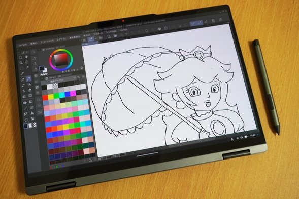 レノボYoga 7 2-in-1 Gen 9 14型 (AMD)1台でもグラフィックスを用いた作業が、より快適に行えそうです。特にこの下でも解説しているように、タブレット変形してデジタルペンでの手書き作業が行えたり、A4サイズで軽く持ち運びに便利なことを考えると、外出時に作業しやすいノートPCとしても活躍できそうです。